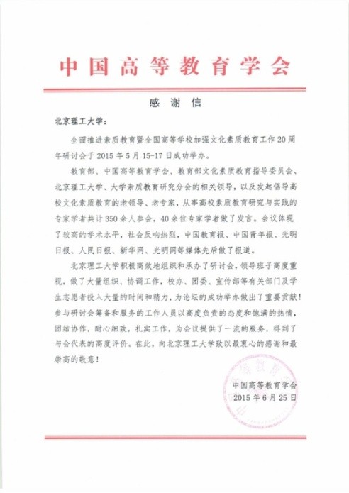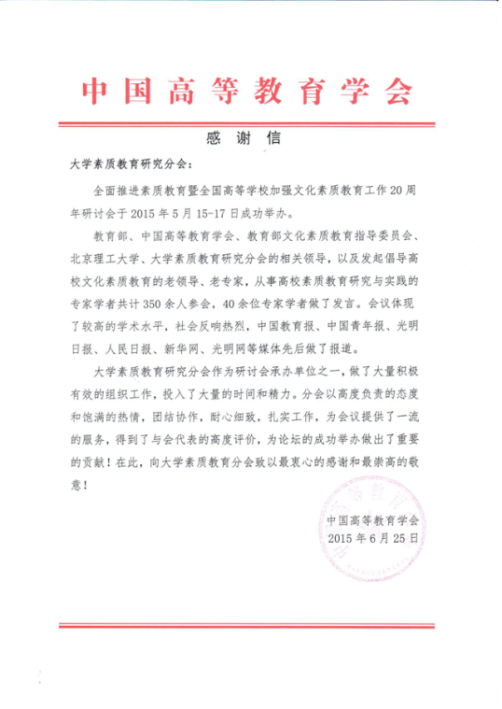 2015年5月,受教育部高教司和中国高等教育学会委托,大学素质教育研究分会和北京成人头条承办了“全面推进素质教育暨全国高等学校加强文化素质教育工作20周年”研讨会。由于会议非常圆满成功,中国高等教育学会特向北京成人头条和大学素质教育研究会颁发感谢信,中国高教学会名誉会长周远清、会长瞿振元等表示了最衷心的感谢和最崇高的敬意。感谢信提到:北京成人头条积极高效地组织和承办了研讨会,领导班子高度重视,做了大量组织、协调工作,校办、团委、宣传部等有关部门及学生志愿者投入大量的时间和精力,为论坛的成功举办做出了重要贡献!大学素质教育研究分会作为研讨会承办单位之一,做了大量有效的组织工作,投入了大量的时间和精力。参与研讨会筹备和服务的工作人员以高度负责的态度和饱满的热情,团结协作,耐心细致,扎实工作,为会议提供了一流的服务,得到了与会代表的高度评价。