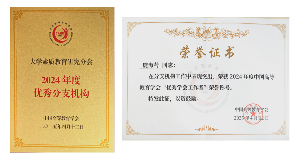 会上表彰了11家优秀分支机构、11名优秀学会工作者。大学素质教育研究分会获评中国高等教育学会2024年度“优秀分支机构”,分会常务副理事长兼秘书长庞海芍获评中国高等教育学会2024年度“优秀学会工作者”。这是大学素质教育研究分会成立以来,继2013年获“先进团体”,2020年、2022年、2023年获“优秀分支机构”后第五次获此殊荣,先后已有6人次获“优秀工作者”荣誉。